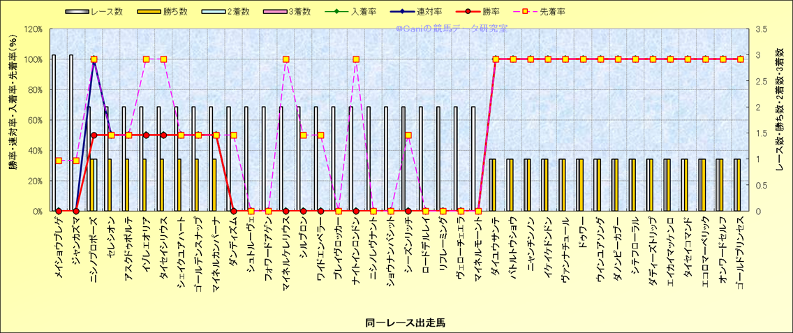 ライバル(相性)解析 同一レースに下記馬が出走した場合の成績とその馬に先着する先着率 |