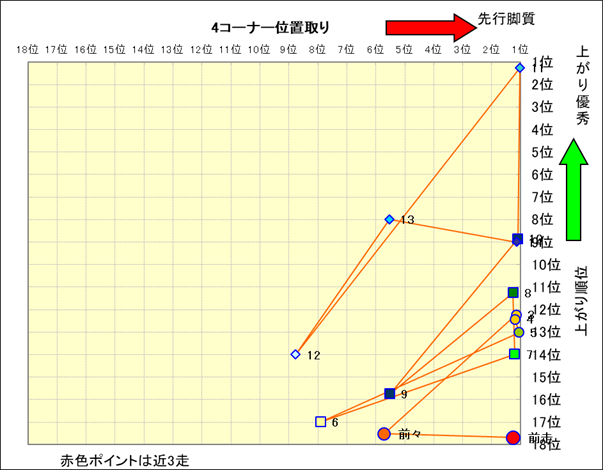 近走における4コーナーでの位置取りと上がり順位(頭数補正後) |