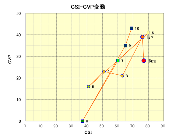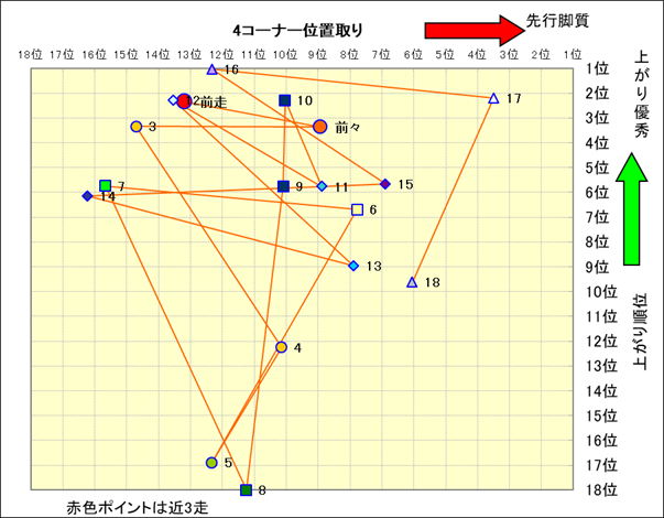 近走における4コーナーでの位置取りと上がり順位(頭数補正後) |