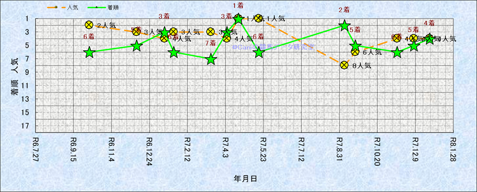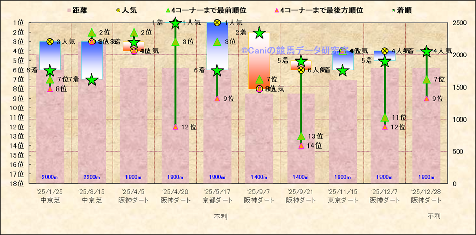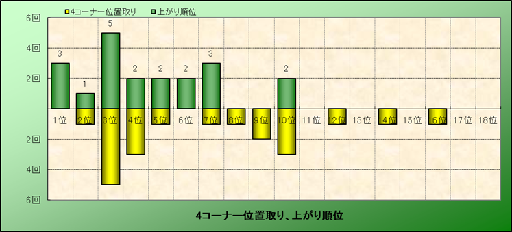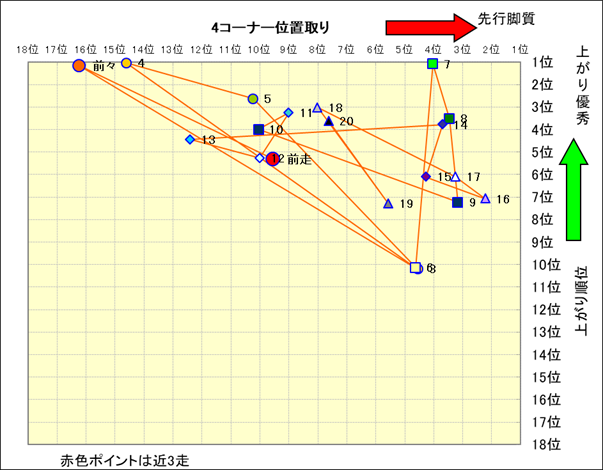 脚質解析 近20レースの4コーナーでの位置取りと上がり順位(頭数補正後) |
