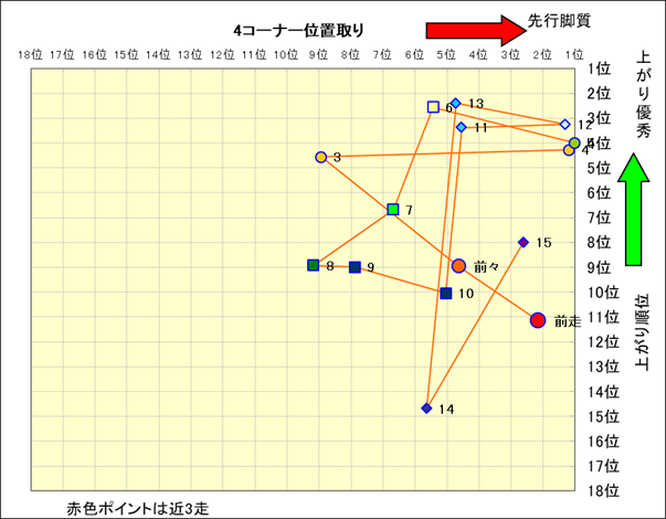 近走における4コーナーでの位置取りと上がり順位(頭数補正後) |