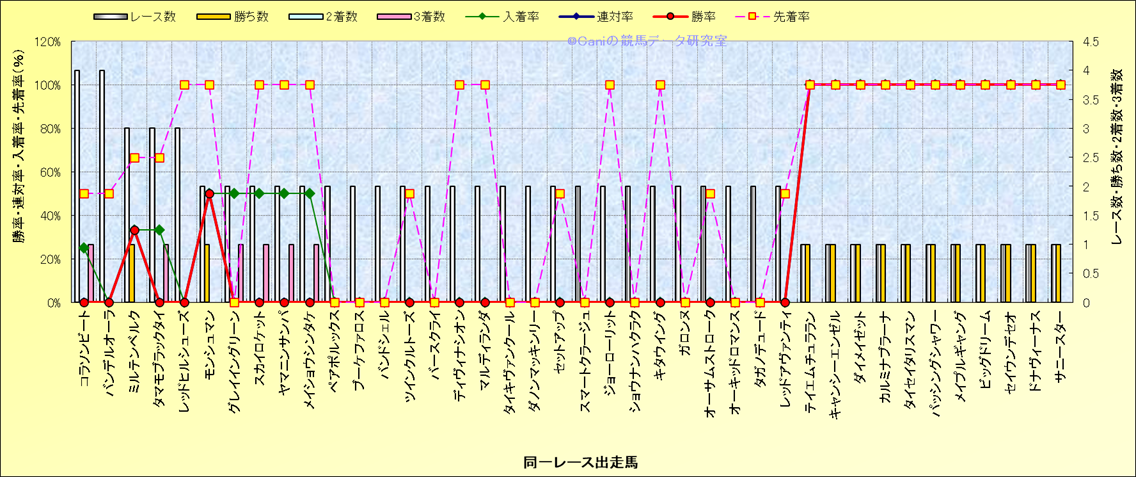 ライバル(相性)解析 同一レースに下記馬が出走した場合の成績とその馬に先着する先着率 |