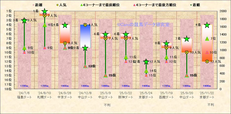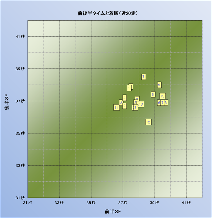 脚質解析 近20レースの4コーナーでの位置取りと上がり順位(頭数補正後) |