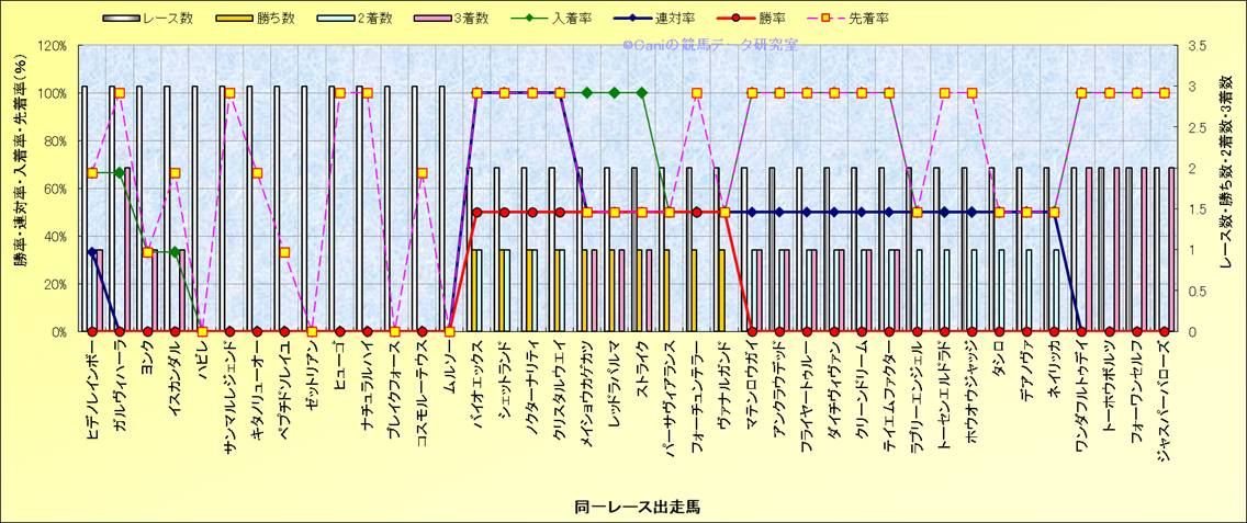 ライバル(相性)解析 同一レースに下記馬が出走した場合の成績とその馬に先着する先着率 |