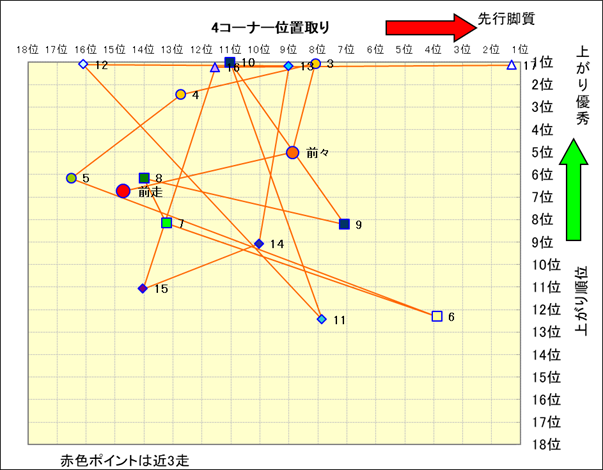 近走における4コーナーでの位置取りと上がり順位(頭数補正後) |