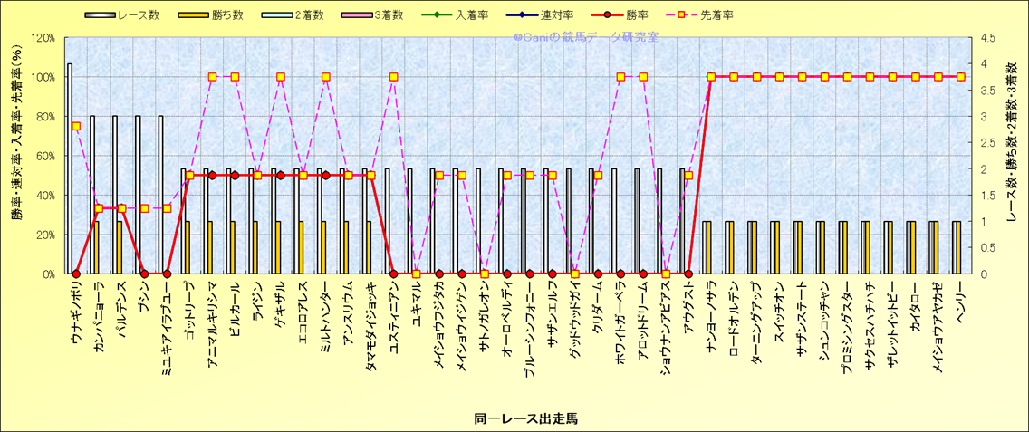 ライバル(相性)解析 同一レースに下記馬が出走した場合の成績とその馬に先着する先着率 |