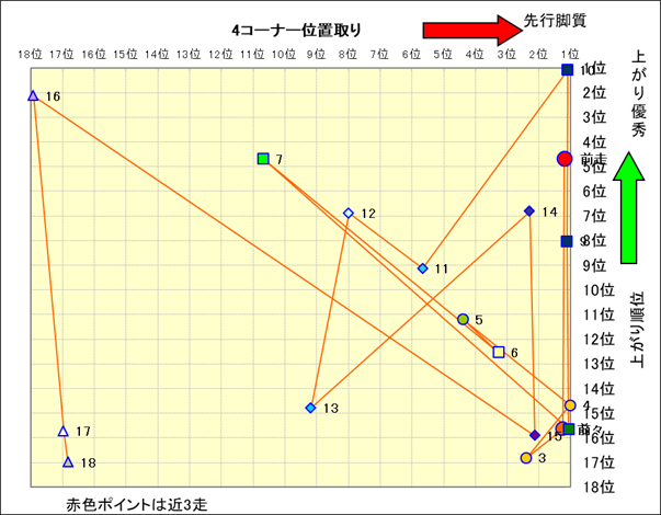 近走における4コーナーでの位置取りと上がり順位(頭数補正後) |