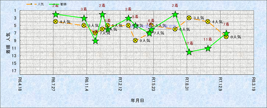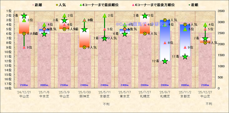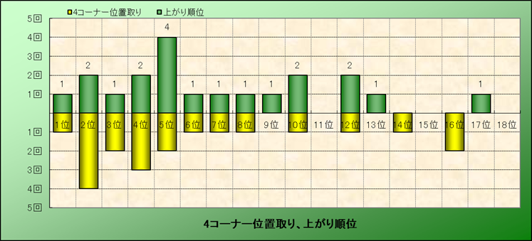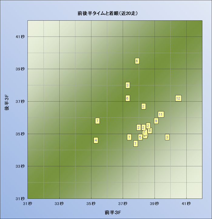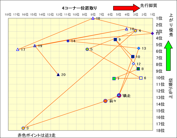 脚質解析 近20レースの4コーナーでの位置取りと上がり順位(頭数補正後) |
