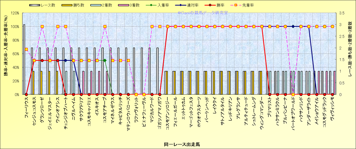 ライバル(相性)解析 同一レースに下記馬が出走した場合の成績とその馬に先着する先着率 |