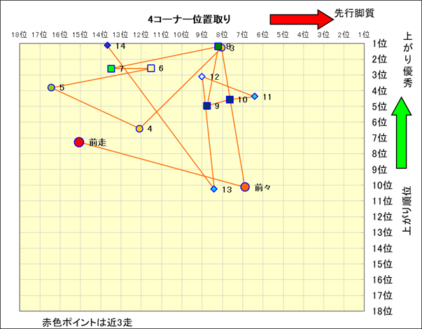 近走における4コーナーでの位置取りと上がり順位(頭数補正後) |