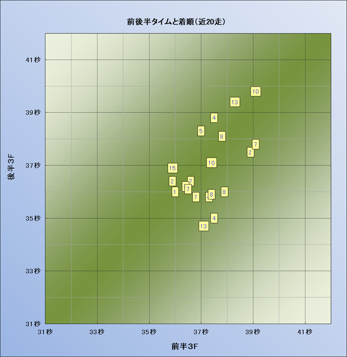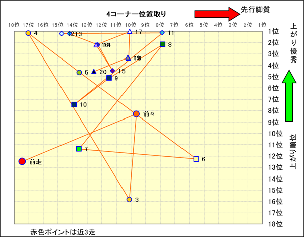 脚質解析 近20レースの4コーナーでの位置取りと上がり順位(頭数補正後) |