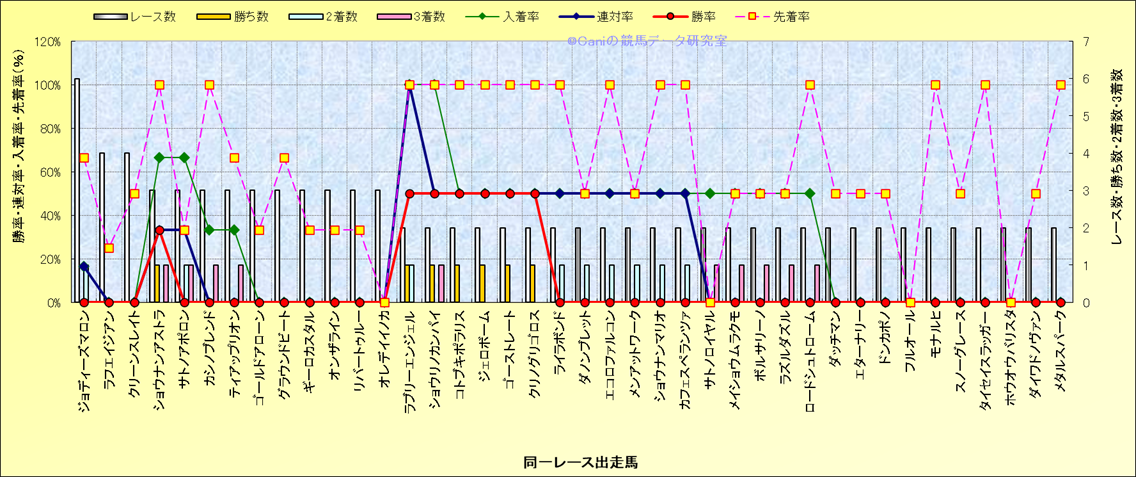 ライバル(相性)解析 同一レースに下記馬が出走した場合の成績とその馬に先着する先着率 |