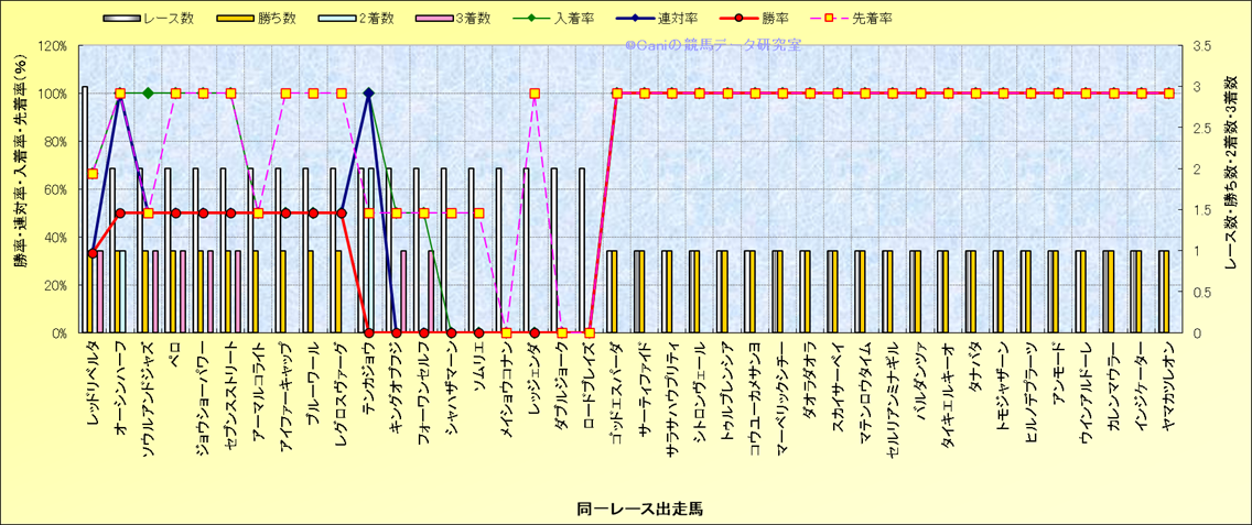 ライバル(相性)解析 同一レースに下記馬が出走した場合の成績とその馬に先着する先着率 |