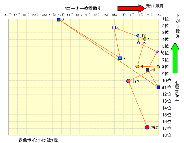 近走における4コーナーでの位置取りと上がり順位(頭数補正後) |