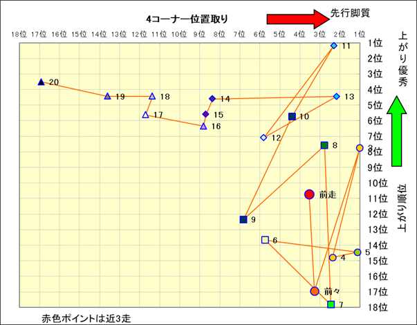 脚質解析 近20レースの4コーナーでの位置取りと上がり順位(頭数補正後) |