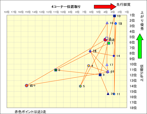 近走における4コーナーでの位置取りと上がり順位(頭数補正後) |