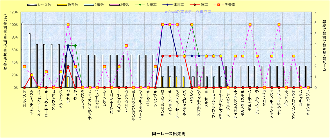 ライバル(相性)解析 同一レースに下記馬が出走した場合の成績とその馬に先着する先着率 |