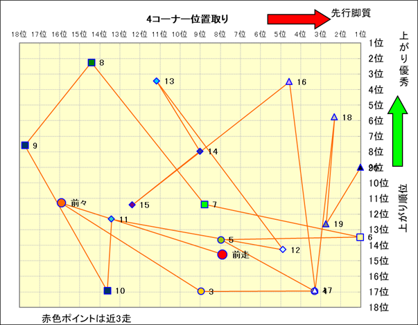 近走における4コーナーでの位置取りと上がり順位(頭数補正後) |