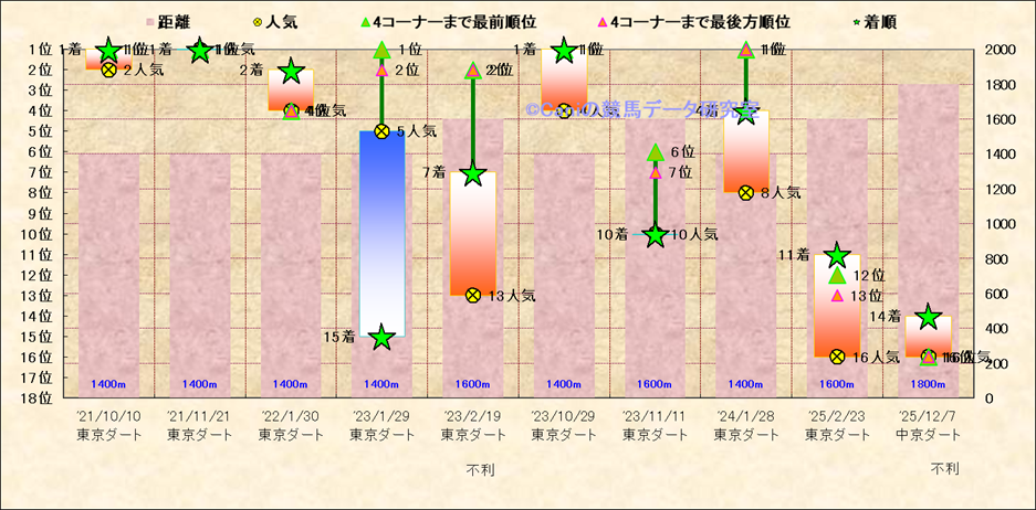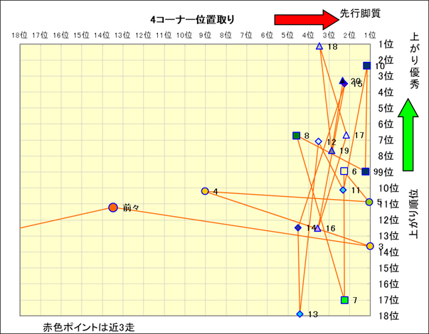 脚質解析 近20レースの4コーナーでの位置取りと上がり順位(頭数補正後) |