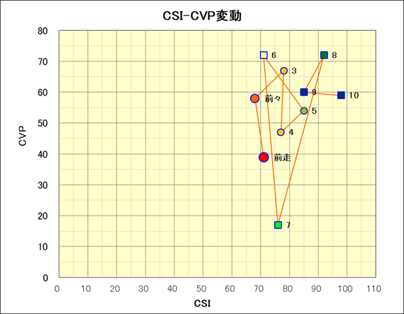 近走における4コーナーでの位置取りと上がり順位(頭数補正後) |