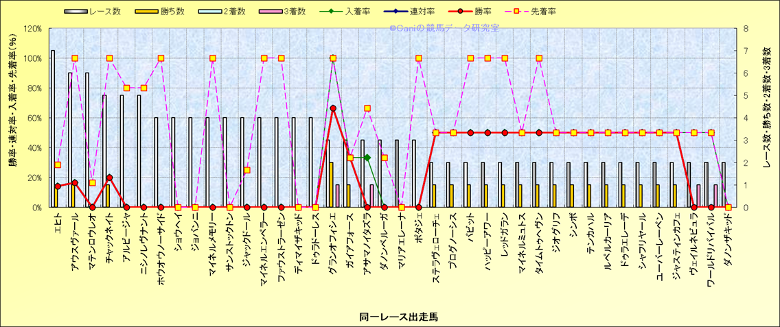 ライバル(相性)解析 同一レースに下記馬が出走した場合の成績とその馬に先着する先着率 |