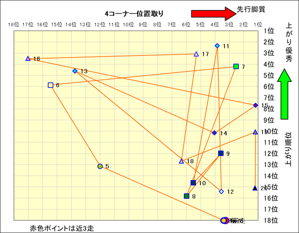 近走における4コーナーでの位置取りと上がり順位(頭数補正後) |