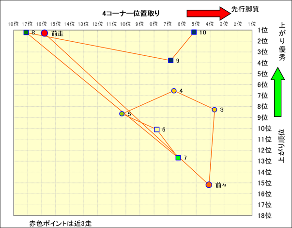 近走における4コーナーでの位置取りと上がり順位(頭数補正後) |