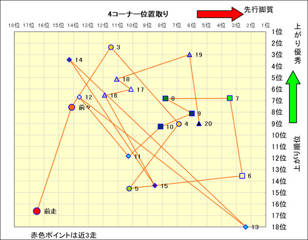 脚質解析 近20レースの4コーナーでの位置取りと上がり順位(頭数補正後) |