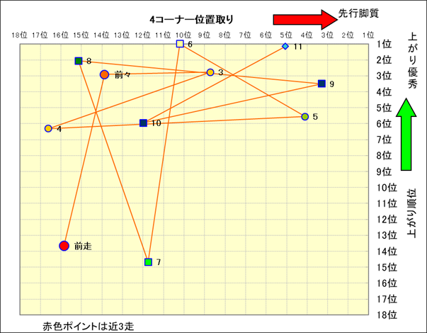 近走における4コーナーでの位置取りと上がり順位(頭数補正後) |