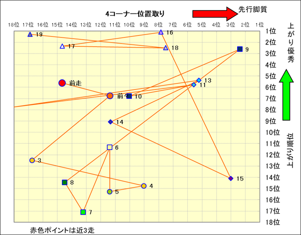 近走における4コーナーでの位置取りと上がり順位(頭数補正後) |