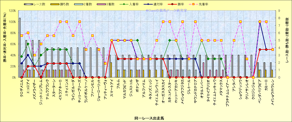 ライバル(相性)解析 同一レースに下記馬が出走した場合の成績とその馬に先着する先着率 |