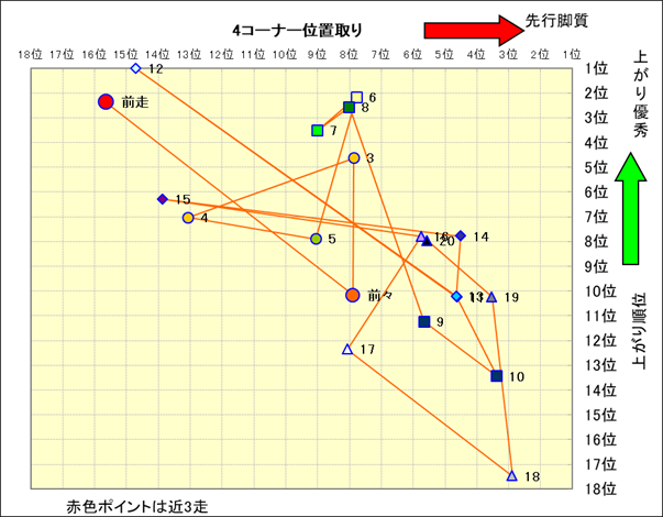 近走における4コーナーでの位置取りと上がり順位(頭数補正後) |