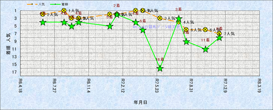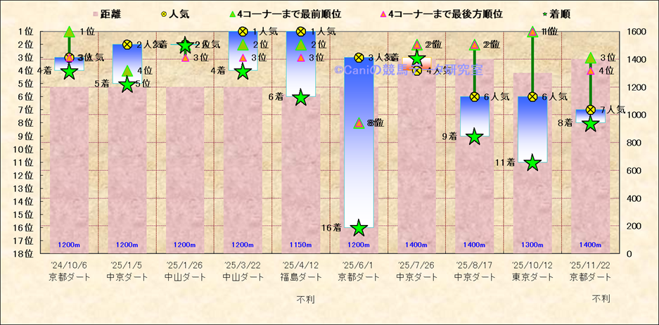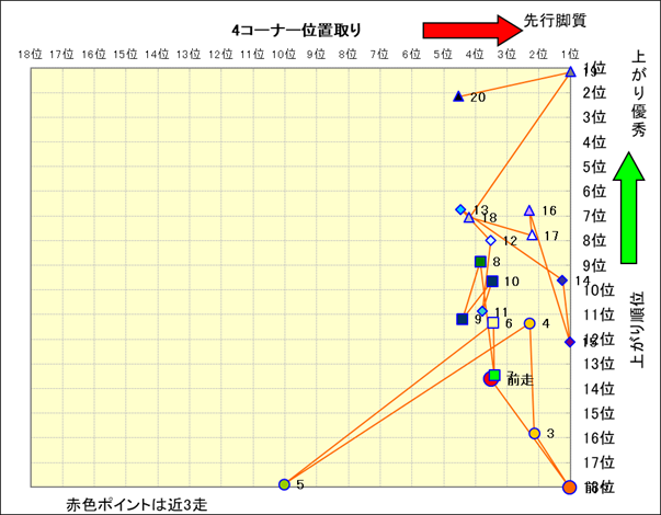 脚質解析 近20レースの4コーナーでの位置取りと上がり順位(頭数補正後) |