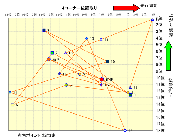 近走における4コーナーでの位置取りと上がり順位(頭数補正後) |