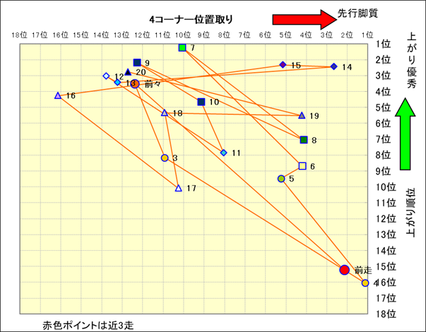 脚質解析 近20レースの4コーナーでの位置取りと上がり順位(頭数補正後) |