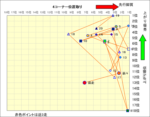 脚質解析 近20レースの4コーナーでの位置取りと上がり順位(頭数補正後) |