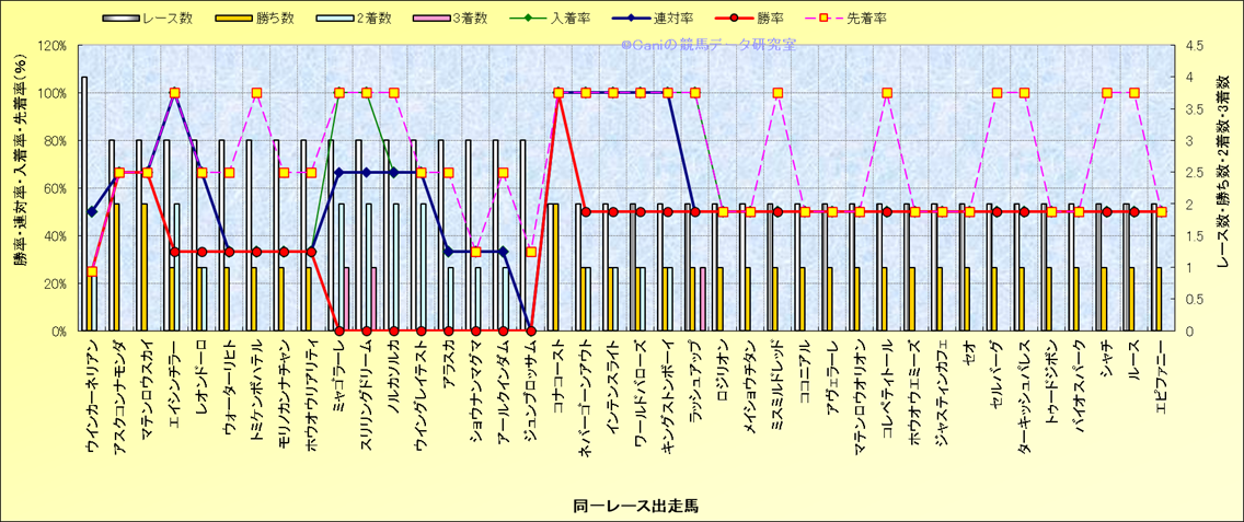 ライバル(相性)解析 同一レースに下記馬が出走した場合の成績とその馬に先着する先着率 |