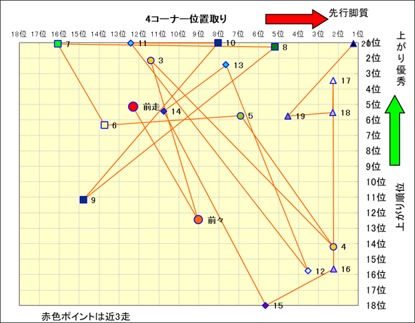 脚質解析 近20レースの4コーナーでの位置取りと上がり順位(頭数補正後) |