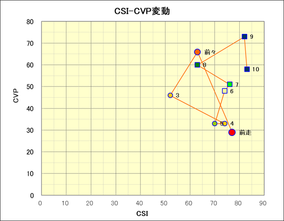 近走における4コーナーでの位置取りと上がり順位(頭数補正後) |