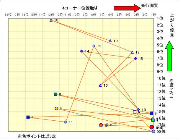 近走における4コーナーでの位置取りと上がり順位(頭数補正後) |