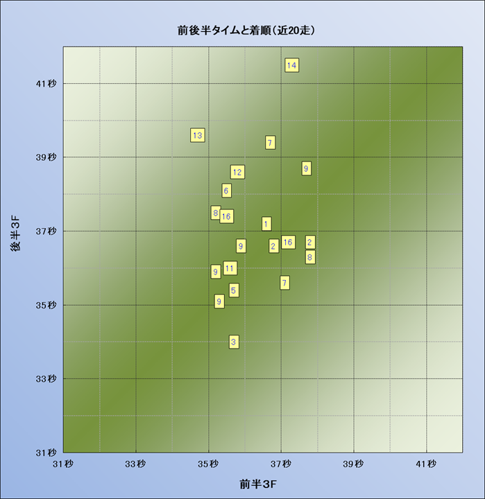 脚質解析 近20レースの4コーナーでの位置取りと上がり順位(頭数補正後) |