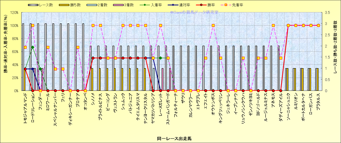 ライバル(相性)解析 同一レースに下記馬が出走した場合の成績とその馬に先着する先着率 |