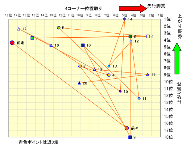 脚質解析 近20レースの4コーナーでの位置取りと上がり順位(頭数補正後) |