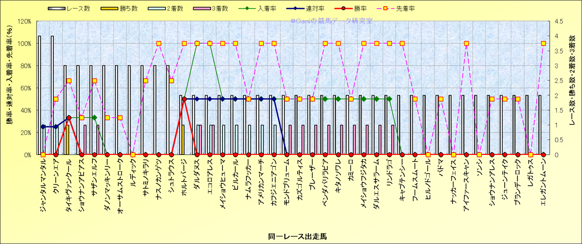 ライバル(相性)解析 同一レースに下記馬が出走した場合の成績とその馬に先着する先着率 |