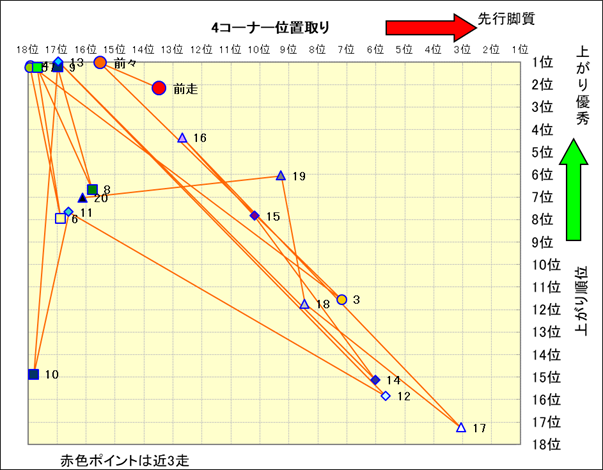脚質解析 近20レースの4コーナーでの位置取りと上がり順位(頭数補正後) |