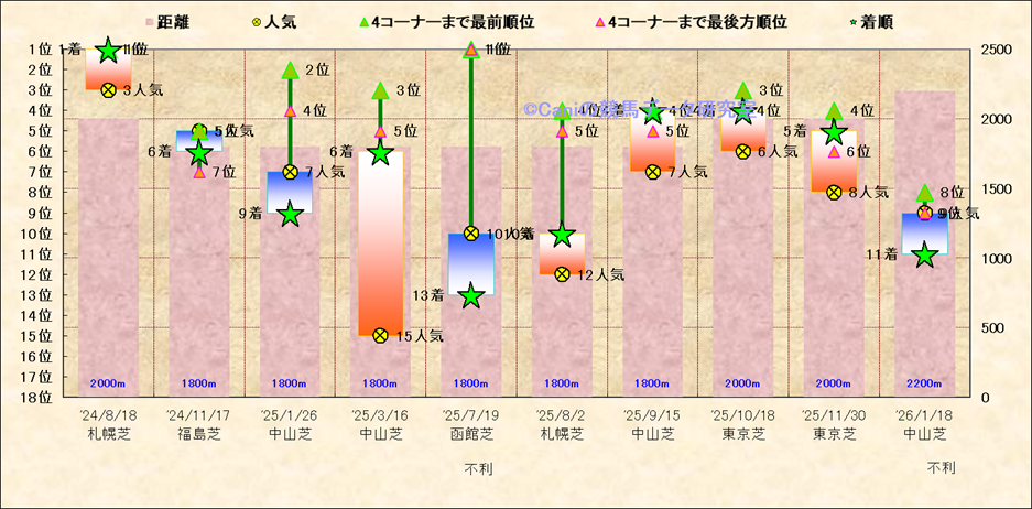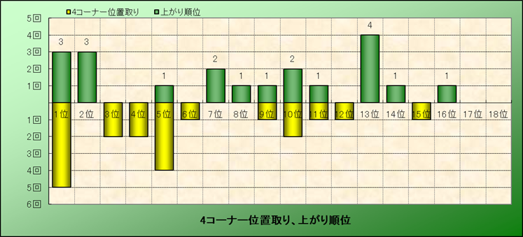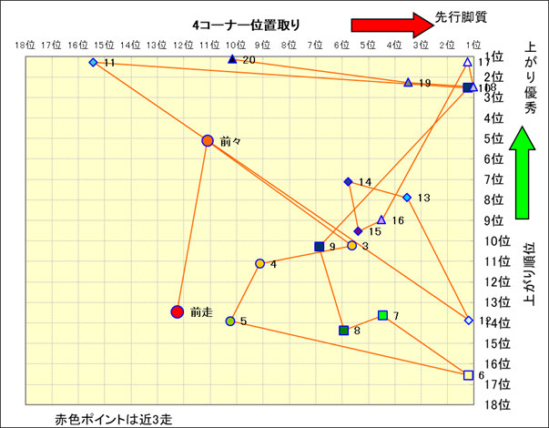 脚質解析 近20レースの4コーナーでの位置取りと上がり順位(頭数補正後) |