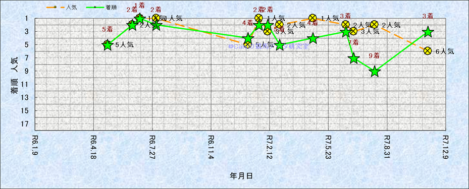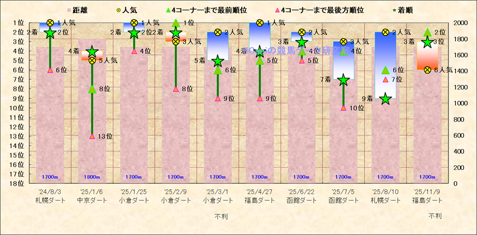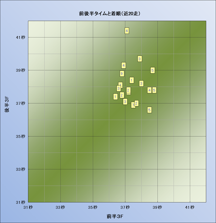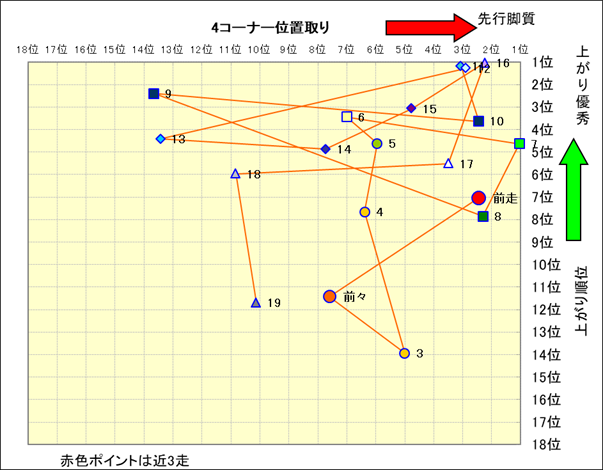脚質解析 近20レースの4コーナーでの位置取りと上がり順位(頭数補正後) |