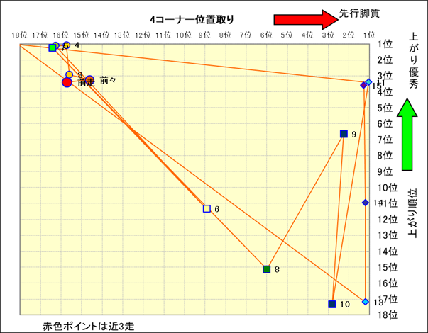 近走における4コーナーでの位置取りと上がり順位(頭数補正後) |