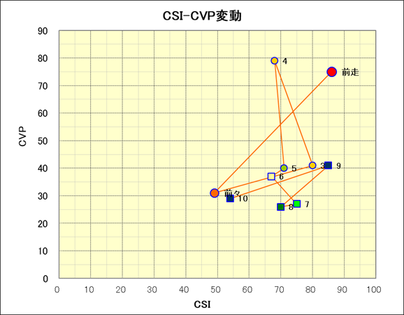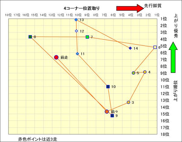 近走における4コーナーでの位置取りと上がり順位(頭数補正後) |
