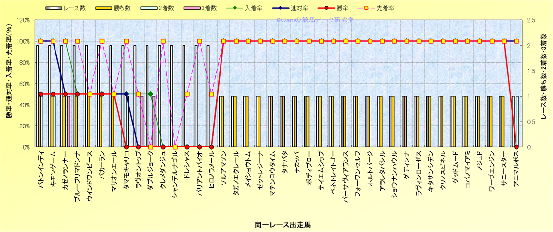 ライバル(相性)解析 同一レースに下記馬が出走した場合の成績とその馬に先着する先着率 |